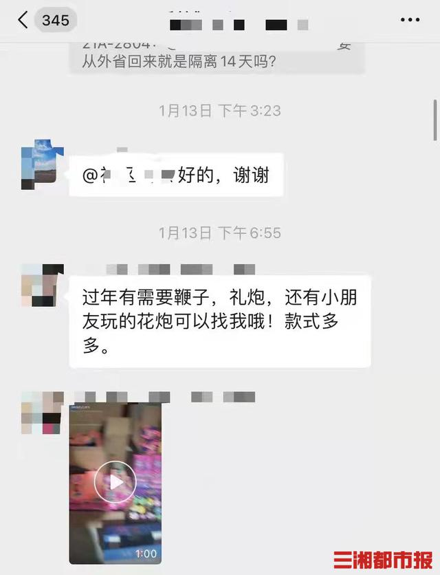 “前段時(shí)間,我在小區(qū)寶媽群里看到,有人發(fā)煙花爆竹的銷(xiāo)售套餐。說(shuō)是有親戚從瀏陽(yáng)過(guò)來(lái),備了點(diǎn)禮花,其中很多都是自家孩子喜歡玩的?!奔易¢L(zhǎng)沙市開(kāi)福區(qū)的朱女士說(shuō),想到馬上快過(guò)年了,她跟相熟的另外6名寶媽合買(mǎi)了煙花套餐,付款第二天下午訂購(gòu)的煙花就送到手中?!爱?dāng)時(shí)我?guī)е畠涸跇窍峦妫Y(jié)果小區(qū)業(yè)主群里就有鄰居說(shuō)不能放煙花,還撥打了110,嚇得我趕緊收了煙花?!?