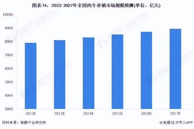 數(shù)據(jù)顯示,去年中國牛肉市場規(guī)模已超過8000億元,2022年甚至有望達(dá)到9000億。而前瞻產(chǎn)業(yè)研究院《中國肉牛養(yǎng)殖及牛肉深加工產(chǎn)業(yè)全景圖譜》也顯示,2022年至2027年全國肉牛養(yǎng)殖市場規(guī)模將不斷上漲。