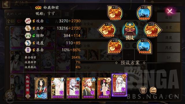 鈴鹿御前(鎖2):傷魂鳥/地藏/鏡姬,速攻暴/速生暴,速度高于面靈氣70%,低于SP蛇,計算器額外屬性:暴傷120%,攻擊10%。