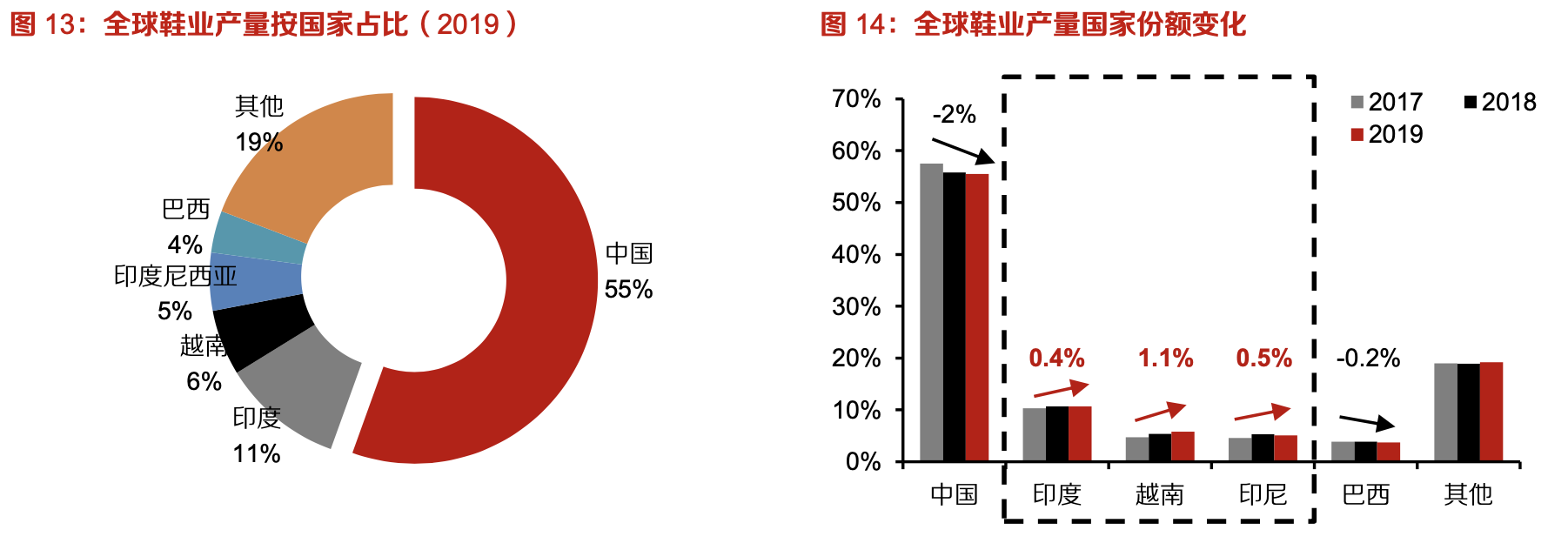 制鞋產(chǎn)業(yè)主要集中在亞洲地區(qū),根據(jù)世界鞋業(yè)年報數(shù)據(jù),中國、印度、越南和印尼是全球前四的產(chǎn) 鞋大國,2019 年產(chǎn)量占比分別為 55%、11%、6%和 5%,合計占比超過 77%。但近年來,中國的 鞋產(chǎn)量份額出現(xiàn)了明顯下滑,產(chǎn)業(yè)鏈逐步向東南亞和南亞地區(qū)轉(zhuǎn)移。2019 年,中國鞋業(yè)產(chǎn)量相比 2017 年下滑了將近 2 pcts,印度、越南和印尼則分別同比上升 0.4、1.1 和 0.5 pcts。從品牌方角 度來看,耐克的鞋履供應(yīng)商中越南和印尼的產(chǎn)量占比逐年提升,而中國則逐年下降,與上述趨勢相符。