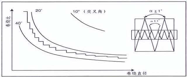 所謂卷繞比,就是橫動(dòng)導(dǎo)紗器每往復(fù)一次,紗筒卷繞的圈數(shù)。卷繞比保持恒定,卷繞角則隨卷裝直徑的逐步增大而變小(見圖3),卷裝容量可比槽筒卷繞增加25%-30%,即同體積下無接頭線長可增加25%-30%,無卷繞重疊,無分紗現(xiàn)象容易退繞。