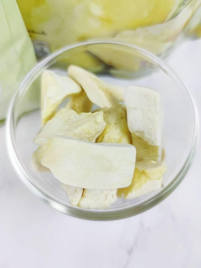 100% 金枕頭榴蓮肉,通過精心挑選直接從園場運送。我第一口吃的時候,感覺到嘴里充滿了甜蜜,口感酥脆,榴蓮味道濃郁,雖然是凍干榴蓮,但是好像是吃到了泰國地道的新鮮榴蓮。而且凍干榴蓮跟新鮮榴蓮的營養(yǎng)一樣。如果你有機(jī)會嘗試肯定會喜歡。
