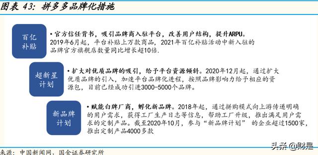 品牌化有助于 ARPU 提升,推動(dòng) GMV 增長,以及廣告貨幣化率的提升,推動(dòng) 收入增長。品牌產(chǎn)品在廣告投放的能力和意愿上比白牌產(chǎn)品更強(qiáng),公司廣 泛的下沉市場滲透以及 C2M 產(chǎn)品定制能力,助力品牌更好的了解用戶需求,用更切合下沉市場用戶需求的產(chǎn)品,幫助品牌實(shí)現(xiàn)用戶圈層的破圈。品牌 化具體的措施包括百億補(bǔ)貼、超新星計(jì)劃、新品牌計(jì)劃。