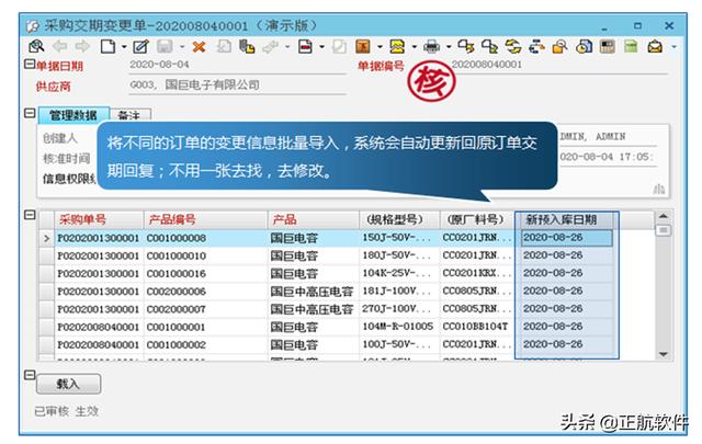 通過正航ERP系統(tǒng)提供的采購進(jìn)貨申請單,原廠清單EXCEL導(dǎo)入并自動匹配來源采購訂單生成進(jìn)貨申請單,簡化進(jìn)貨申請工作,也避免了人工錄入數(shù)據(jù)可能出現(xiàn)錯誤的風(fēng)險。