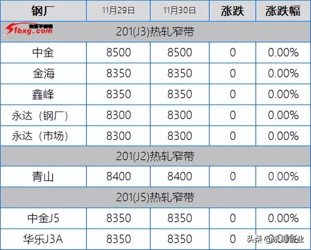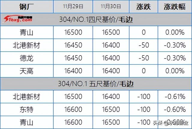 今日,青山代理報(bào):鼎信304窄帶冷軋16000元/噸,熱軋16100元/噸。市場貿(mào)易商報(bào)價(jià)可見:鼎信窄帶含稅16000-16100元/噸,部分不含稅14900-15000元/噸。上泰含稅15900-16000元/噸。鑫峰、金海、永達(dá)含稅15750-15800元/噸,高位在15900元/噸左右,部分不含稅14600-14700元/噸。大板方面,青山、北港新材、聯(lián)眾、德龍四、五尺現(xiàn)貨含稅16400-16500元/噸,個別規(guī)格高位在16600元/噸。