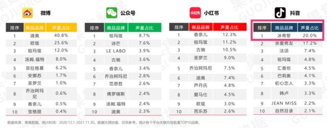 國際品牌在微博、公眾號、小紅書上的聲量更高,冰希黎就常駐抖音。