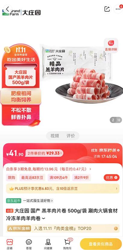 買了空氣炸鍋,視頻網(wǎng)站就自動(dòng)推送了用空氣炸鍋?zhàn)龅姆N種美食。想到之前做肥羊鍋用完了肥羊卷,還是再買點(diǎn)囤上吧。在京東上搜了下大莊園的羔羊肉片卷,500g規(guī)格的,之前買過幾次這個(gè)牌子的,純羊肉切片,肉質(zhì)夠嫩,價(jià)格也還適中,就固定買這個(gè)了。結(jié)果一看價(jià)格才41.9元,感覺比前兩次買的要便宜不少。