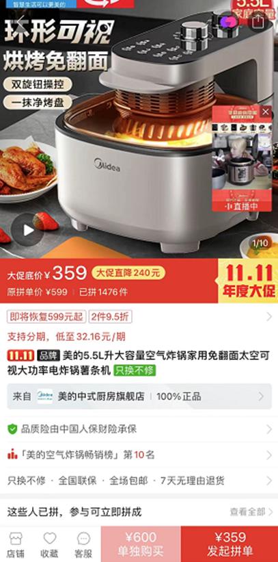 在拼多多上搜了下空氣炸鍋,價(jià)位從100+到5、600的都有,不過還是選個(gè)大牌子的才有保障。翻了翻推薦看中了美的的一款空氣炸鍋,獨(dú)特的悅動(dòng)旋風(fēng)盤和立體烤盤的設(shè)計(jì),促進(jìn)熱力均勻循環(huán),炸烤食物無需翻面;9葉離心風(fēng),加速熱氣流動(dòng),讓食物熟度均勻;5.5L大容量,足以放下一只完整的烤雞,烤物多也放得下;270°可透視窗設(shè)計(jì)輕松感知食物,防焦糊;雙旋鈕控溫定時(shí),操作簡單。359元的售價(jià)雖然在預(yù)算范圍內(nèi),但還是略貴了,想找找看有沒有更便宜的價(jià)。