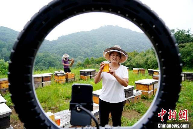 當(dāng)?shù)仞B(yǎng)蜂合作社社員通過網(wǎng)絡(luò)直播平臺(tái)推介蜂蜜。 宋繼昌 攝