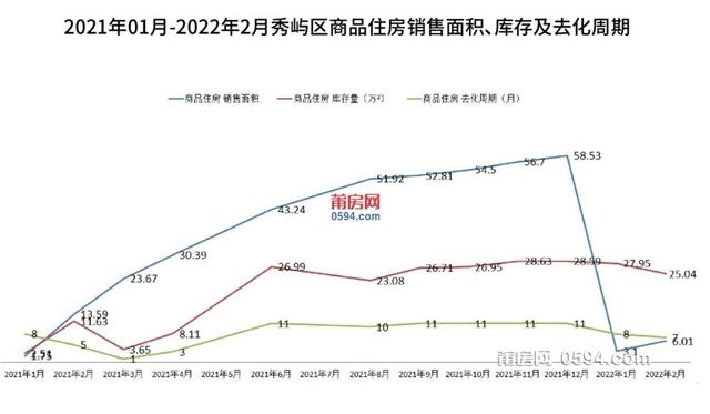 秀嶼區(qū)2021年12月末庫存量40.33萬㎡,去化周期15月。其中住宅庫存量28.59萬㎡,去化周期11月;商業(yè)庫存量4.19萬㎡,去化周期47月;辦公庫存量7.55萬㎡去化周期108月。