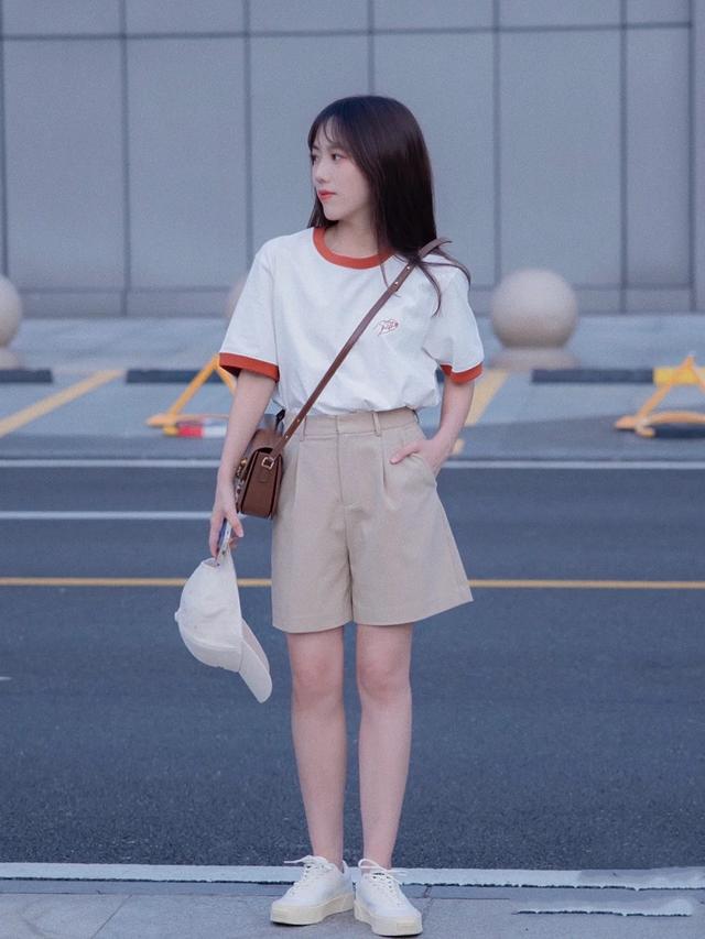 清清爽爽的白色T恤,夏天里真的是特別的好穿。不管是二十歲還是七十歲,都可以相信白色T恤的魅力。撞色的圓領(lǐng)設(shè)計,清新又吸睛。搭配卡其色的短褲,視覺上更加清爽,配一雙小白鞋,也是非常有清新少女感的組合。