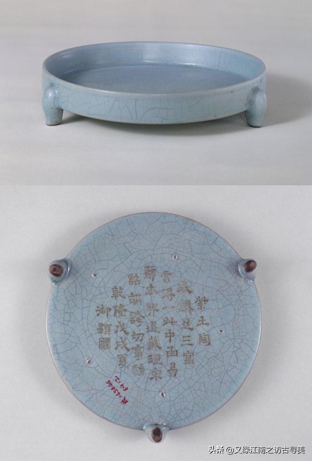 北京故宮藏汝窯天青釉三足樽承盤,宋,高4厘米,口徑18.5厘米,足距16.9厘米。