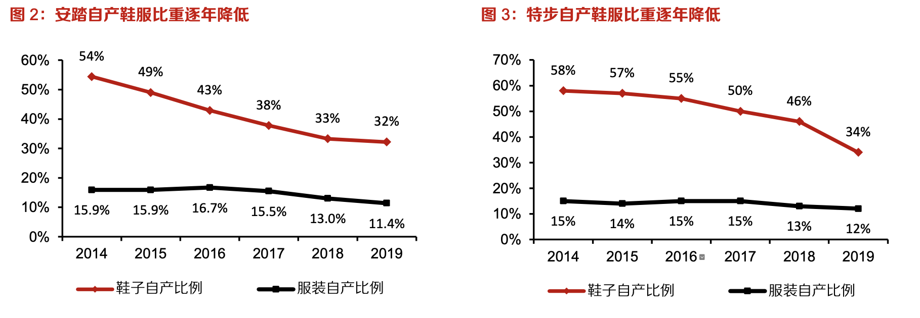 3)混合模式,但近年來自產(chǎn)比例逐步降低。以國內(nèi)頭部運動品牌安踏和特步為例,我們觀察到: 1)兩公司鞋履的自產(chǎn)比例明顯高于服裝;2)近年來無論是鞋履還是服裝的自產(chǎn)比重都有所下降, 并且鞋履的下降幅度遠大于服裝,具體來看,安踏和特步的鞋履自產(chǎn)比例分別從 2014 年 54%和 58%,下降至 2019 年的 32%和 34%,下降幅度超過 20+ pcts。