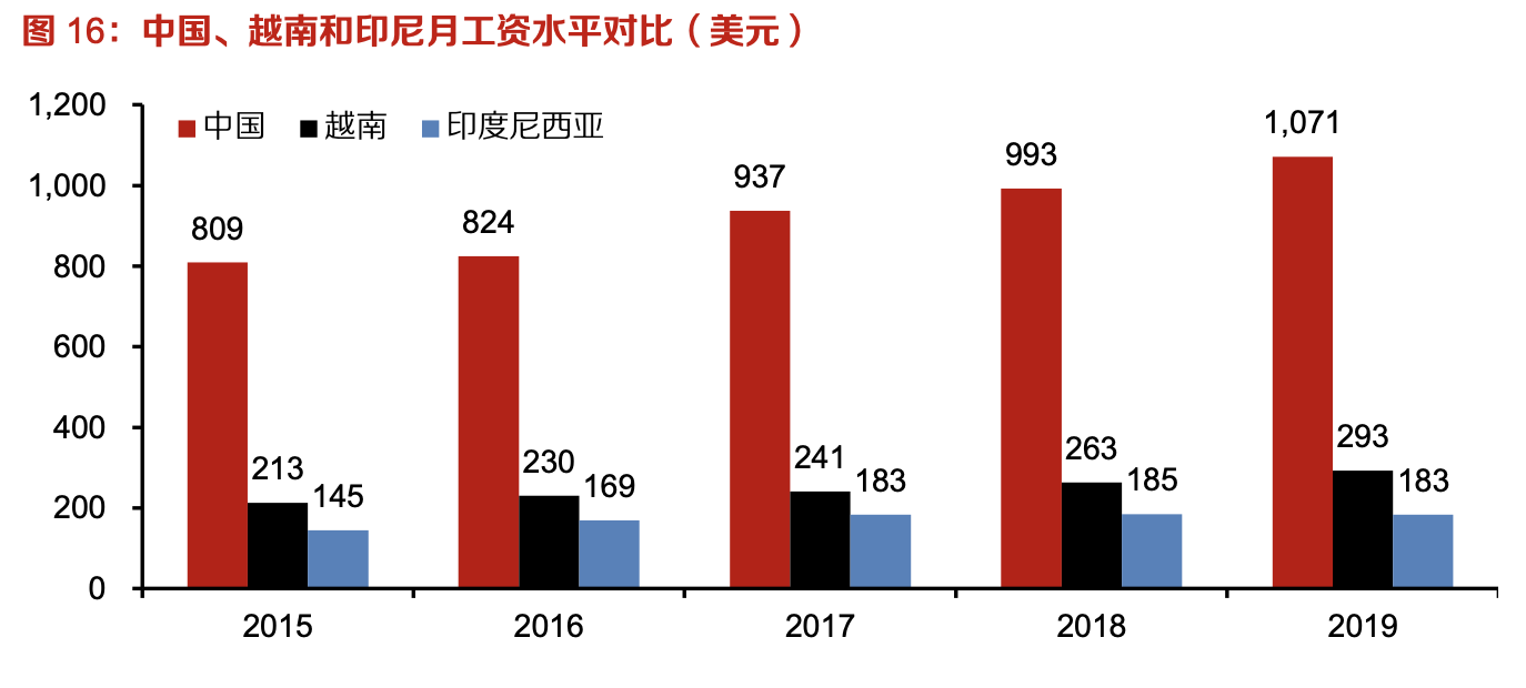 認為,產(chǎn)業(yè)鏈轉(zhuǎn)移的核心原因與行業(yè)屬性有關(guān),制鞋業(yè)是勞動力密集型產(chǎn)業(yè),勞動力資源是影 響產(chǎn)業(yè)發(fā)展和轉(zhuǎn)移的最重要因素之一。歷史上,制鞋業(yè)的產(chǎn)業(yè)中心已發(fā)生過多次轉(zhuǎn)移,從早期的意 大利和西班牙,到 80 年代的日本、臺灣和韓國等地,進入 90 年代后又轉(zhuǎn)移至成本更低的中國廣 東、溫州等地,每次轉(zhuǎn)移都和勞動力成本緊密相關(guān)。根據(jù) CEIC 數(shù)據(jù),從平均工資水平來看,越南 和印度尼西亞的工資水平遠低于國內(nèi),2019 年的平均工資僅為中國的 20-30%左右,此外,東南 亞國家也為外商提供了很多投資優(yōu)惠政策,例如越南的“四免九減半”的所得稅特殊優(yōu)惠,緬甸、 柬埔寨和印尼也推出了 3 年以上額所得稅免征期。