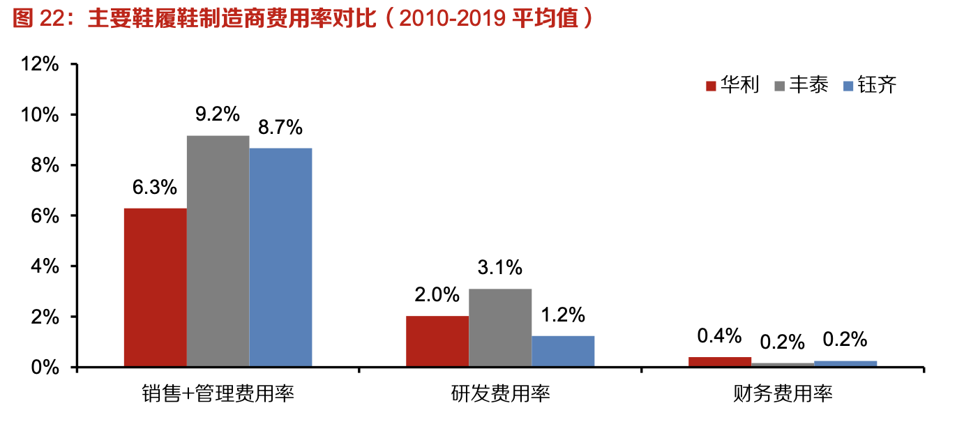 凈利率方面:華利>豐泰>鈺齊>裕元,華利在毛利率略低于豐泰的前提下,凈利率反超 2-3 pcts 左 右,主要源自于華利較低的期間費用率,背后的原因:1)華利地處越南北部,員工薪酬等開支較 低,2)華利工廠主要集中在越南,豐泰工廠分布較廣,華利管理效率較高;裕元集團的業(yè)績中包 含零售業(yè)務(wù)寶勝國際(收入占比約 39%),未單獨披露制造業(yè)務(wù)的費用率和凈利率,但另一方面, 2019 年裕元集團的綜合凈利率約為 3.5%,而寶勝國際約為 3.2%,由此可推測制造業(yè)務(wù)凈利率略 高于 3.5%,遠低于華利、豐泰和鈺齊。