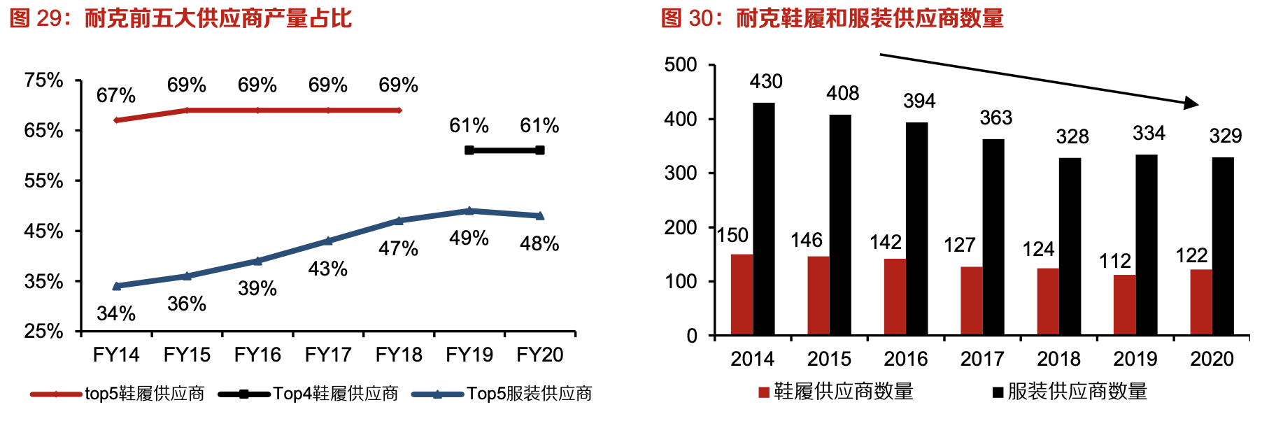 運動鞋履供應(yīng)商集中度更高、競爭格局趨于穩(wěn)態(tài),而運動服飾仍然在整合過程中。從耐克供應(yīng)商數(shù) 據(jù)來看,鞋履供應(yīng)商的集中度大幅高于服裝,且近幾年穩(wěn)定性較強,F(xiàn)Y15-FY18 前五大鞋履供應(yīng) 商產(chǎn)量占比均維持在 69%左右,F(xiàn)Y19-FY20 前四大鞋履供應(yīng)商占比維持在 61%(耐克披露口徑變 化),服裝供應(yīng)商方面,近幾年的集中度在緩慢提升的過程中,但直到 FY20 仍未突破 50%。此 外,從耐克的供應(yīng)商數(shù)量來看,服裝供應(yīng)商近幾年出現(xiàn)了較大幅度的收縮,從 FY14 年的 430 家收 縮至 FY20 的 329 家,表明服裝供應(yīng)商仍處在精簡和整合的過程中,鞋履供應(yīng)商數(shù)量雖然也有所 精簡,但幅度相對較小。
