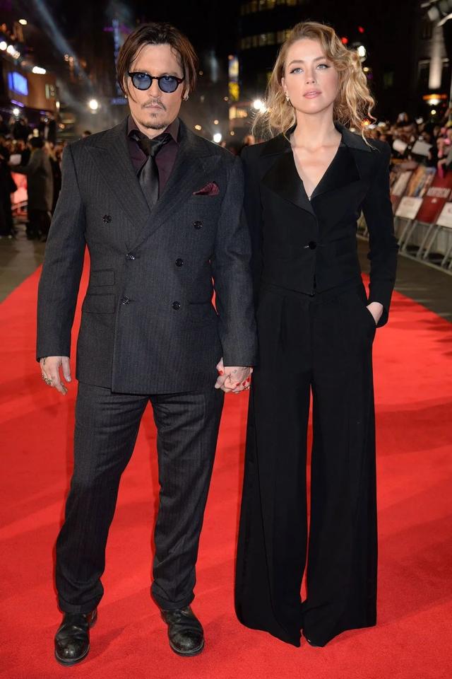 在電影「貴族大盜」的倫敦首映禮上,Depp身穿「Ralph Lauren - 拉夫勞倫」Purple Label的雙排扣條紋西裝,而Amber則穿著類似的闊腿褲套裝。